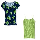 Manufacturer's Description: Flowery Peasant Top: Add a cheerful touch of color to your outfit with Aeropostale's Flowery Peasant Top. It's crafted with a floral print pattern, a 5-button placket and a drawstring-adjustable waist. Throw it on with some cute skinny jeans or a pair of dark leggings. ~ Size: X-Large. ~ Relaxed fit. ~ Style: 5717. ~ Color: Navy Night. ~ Material: 60% cotton, 40% polyester. ~ Machine wash/dry. Solid Basic Camisole: Whether you wear it with your favorite jeans or sweats or underneath a cozy hoodie, Aeropostale's Solid Basic Cami promises unbeatable stretchy comfort. Shelf-bra included. ~ Size: X-Large. ~ Slim fit. ~ Style: 4570. ~ Color: Dark Green 377. ~ Material: 95% cotton, 5% spandex. ~ Machine wash/dry. *(O)*