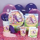 Butterfly 1st Birthday Basic Party Pack. Includes8 invitations9 party plates8-9 oz. cups16 luncheon napkins16 pc. purple cutlery set1 hot pink plastic table cover2 rolls of streamers 1 purple and 1 pink12 each of purple and light pink balloons2 pkgs. of confetti 1 purple and 1 light pink OTC List Price: Price:
