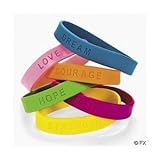 These rubber bracelets have imprinted inspirational messages: COURAGE, DREAM, HOPE, LOVE, FAITH and STRENGTH. Wear one or several on your wrists! This jewelry makes a colorful party favor for goody bags at a church or Sunday School party. Kids love to collect these bracelets and share them with friends! (2 dozen per unit) 8"