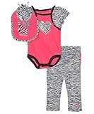 Akademiks adds some street-smart style to this 3-piece outfit! All items are made of soft materials for baby's comfort. Includes: Bodysuit: zebra shrug accent, tagless collar interior, easy-change snaps on bottom, ruffle trim, heart graphic with embroidered logo. (100% Cotton) Bib: snap fastener, zebra stripe trim, "Love" design. (60% Cotton, 40% Polyester) Leggings: elastic waistband, zebra print, embroidered logo on front cuff, ruffle striping on backside. (60% Cotton, 35% Polyester, 5% Spandex) Machine Wash Cold Made in China